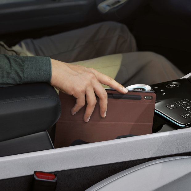 Орталық консольдегі шыныаяқтарды пайдаланбаған кезде алып тастауға болады және планшетті немесе басқа заттарды осы бөлімге орналастыруға болады.