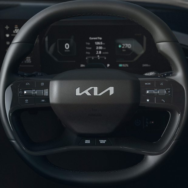 Kia EV9 может адаптироваться под ваш стиль вождения. Выбирайте режимы Normal, Sport или Eco, используя кнопку на руле или голосовую команду, для более интенсивного разгона в спортивном режиме или повышения экономичности в режиме Eco