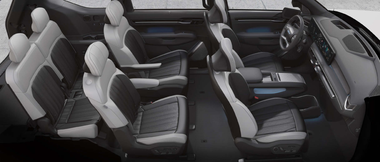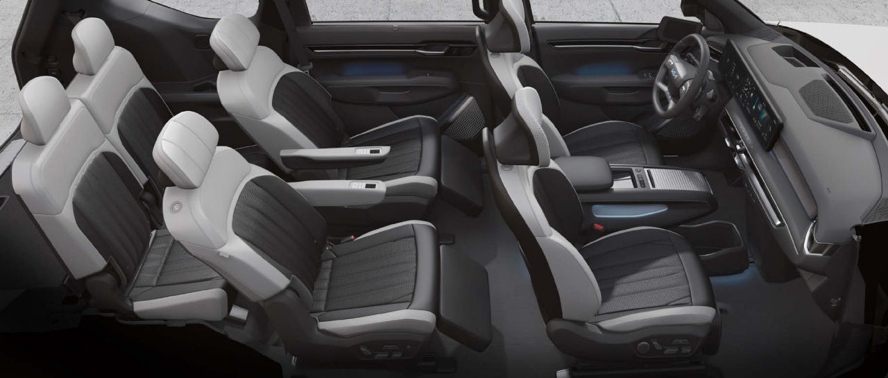 Текстуры и цвета отделки салона Kia EV9 вдохновлены природой. Создатели его интерьера задействовали экологически чистые материалы, которые Kia считает обязательными к использованию в своих новейших моделях. В «природное» обрамление изящно, со вкусом интегрированы самые современные технологии.