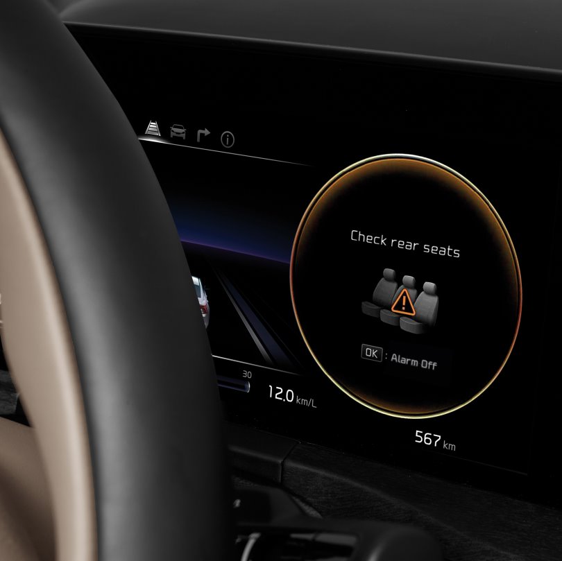 Определяет присутствие пассажира на заднем кресле по открыванию и закрыванию задних дверей и датчикам внутри салона. Предупреждает водителя о необходимости проверить заднее кресло, подавая сигнал тревоги, отображая сообщение на кластере